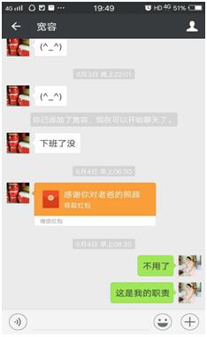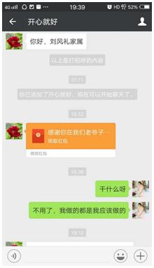 趙阿娟曾經(jīng)護(hù)理過(guò)一位病人,因?yàn)榧?xì)心的護(hù)理和照料,家屬對(duì)她感激不已,兩位家屬先后希望以微信紅包的方式表達(dá)他們的感謝:“阿娟,老爺子在病重期間得到你悉心的照料,老人特別感激你,經(jīng)常對(duì)我們說(shuō)要好好感謝你。現(xiàn)在老人走了,我們替老人完成他未了的心愿,以表達(dá)我們的感激之情。錢(qián)不多,可這是我們?nèi)业男囊猓?qǐng)收下紅包,不要讓老人心里有遺憾。本來(lái)想給孩子買(mǎi)點(diǎn)吃的,但是不方便給你。如果你不領(lǐng)紅包,我們心里會(huì)很難過(guò)?!?BR style="FONT-FAMILY: "> “阿姨,這是我應(yīng)該做的,用心做好護(hù)理工作,這是我的職責(zé)。老爺子走了我也很難過(guò)。”趙阿娟平靜的回答道。這是多么樸實(shí)又讓人欽佩的回答??!