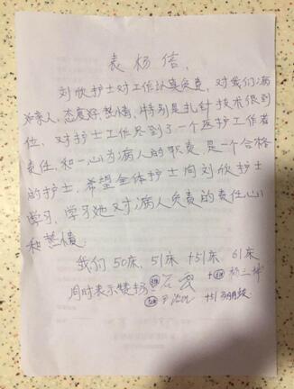 雖然不是第一次受到表揚,雖然是幾句簡短的話語,但這封由兩個病室4位患者聯(lián)名送來的表揚信,著實讓劉欣護士倍感激動。當她接過家屬手里表揚信時,不停地說:“這是我應該做的,你們太客氣了?!?BR style="FONT-FAMILY: "> 劉欣護士已經(jīng)來院工作7年了,2000多個日夜堅守,從未使她的熱情褪去分毫,病房里是她忙碌的身影,病床前是她輕聲的叮嚀。
