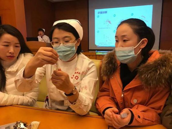 臨床工作中護(hù)士是胰島素泵直接操作者,每個護(hù)士須具備扎實的操作技術(shù)。為提高護(hù)士的操作水平并規(guī)范護(hù)士的操作,在講座結(jié)束后分組進(jìn)行了胰島素泵的現(xiàn)場模擬操作,包括胰島素泵管路的安裝、泵的植入、餐前大劑量的注射及各種參數(shù)的查詢。操作環(huán)節(jié)一開始,護(hù)士們都躍躍欲試,熱情高漲。在每組指導(dǎo)員的帶領(lǐng)及指導(dǎo)下,每個護(hù)士都體驗了實際操作,操作過程中,護(hù)士提出疑惑,指導(dǎo)員及時解答,同時指出并糾正護(hù)士操作中的問題,聯(lián)絡(luò)員們表示受益匪淺。