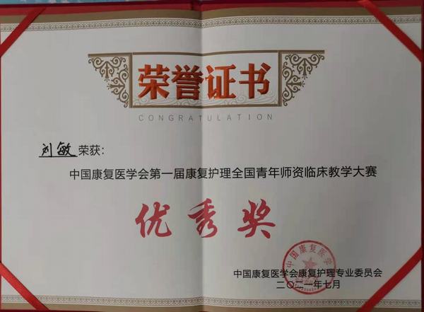 熱烈祝賀我院康復(fù)醫(yī)學(xué)科劉敏護士長榮獲“中國康復(fù)醫(yī)學(xué)會第一屆康復(fù)護理全國青年師資臨床教學(xué)大賽”優(yōu)秀獎