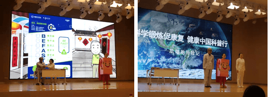 本次比賽,我院護理部高度重視,層層選拔人員,時時關(guān)注進度,并邀請具有比賽經(jīng)驗和演講功底的老師進行全程指導(dǎo)?!都〖毎麣v險記》由張莎扮演肌細胞、灰猛強扮演患者王大爺、董星辰演繹康復(fù)??谱o士,以肌細胞為第一人稱生動的講述了它的歷險經(jīng)歷,而王大爺也形象的還原了生活中患者的真實情況,十分有代入感,康復(fù)??谱o士則通過扎實的專業(yè)知識通俗易懂的指導(dǎo)患者正確康復(fù)運動,體現(xiàn)了康復(fù)專科護士在腦卒中患者康復(fù)過程中的價值。除此之外,作品還強調(diào)了快速識別腦卒中的重要性以及溶栓治療的及時性。
