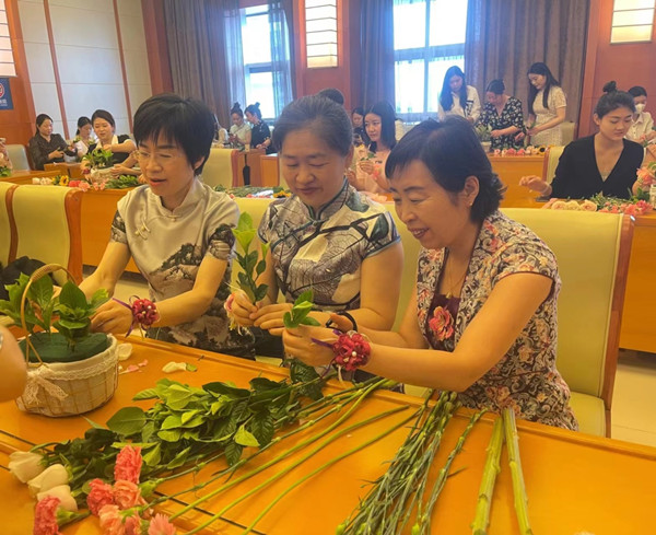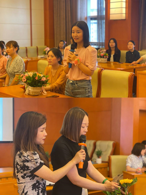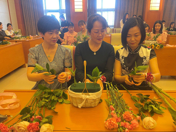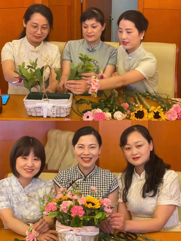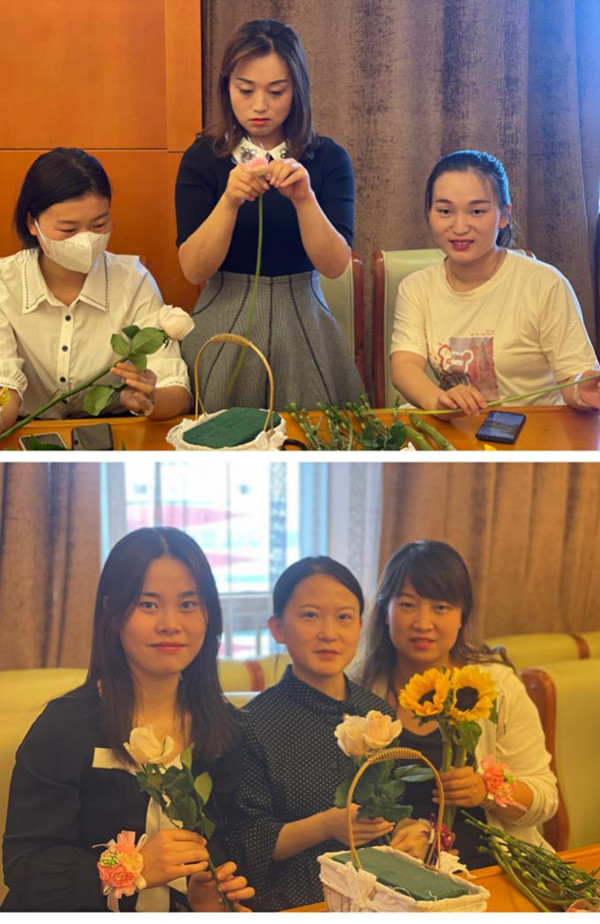 嬌艷的玫瑰、如火的康乃馨、淡雅恬靜的勿忘我、潔白的百合頗有藝術(shù)地插在花籃里,有的千姿百態(tài)、有的古典高雅、有的雍容華貴、有的溫文爾雅、有的小家碧玉…一個個漂亮的小花籃就這樣誕生了!作品完成后花藝?yán)蠋煂γ拷M的作品進(jìn)行逐一點評并評選出優(yōu)秀作品?!安寤◣煛眰儼炎蠲篮玫淖8?,送給在場備受尊重的老師們,寓意“美麗花籃送祝福,愿美好生活與您永相伴”
