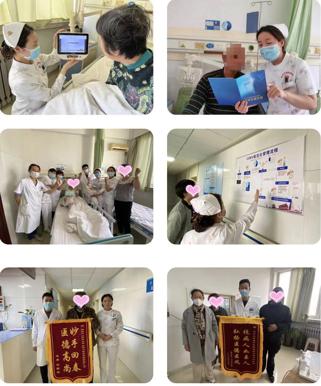 在深入開(kāi)展“無(wú)痛、安寧療護(hù)”病房工作的基礎(chǔ)上,積極推進(jìn)“陜西省CINV規(guī)范化治療示范病房”創(chuàng)建工作,根據(jù)CINV規(guī)范化管理流程,著力打造“無(wú)嘔病房”。為確?!盁o(wú)嘔病房”工作順利開(kāi)展,科室對(duì)全員進(jìn)行培訓(xùn)上崗,成立CINV小組,建立健全首診問(wèn)診制度,明確醫(yī)生、護(hù)士職責(zé),每位醫(yī)護(hù)人員掌握相關(guān)知識(shí),了解惡心、嘔吐( CINV )治療的重要性。掌握CINV評(píng)估方法,制定患者化療方案,評(píng)估患者致吐風(fēng)險(xiǎn)及預(yù)期性嘔吐,根據(jù)CINV致吐風(fēng)險(xiǎn)評(píng)估結(jié)果為患者制定個(gè)體化的止吐方案。自患者入院開(kāi)始,護(hù)士就通過(guò)“化療患者關(guān)愛(ài)手冊(cè)”床頭平板視頻播放等多渠道,從飲食、藥物、心理等多方面進(jìn)行宣教,降低患者惡心、嘔吐發(fā)生率。定期開(kāi)展患者健康教育、社會(huì)支持以及患者之間的分享交流座談會(huì),由醫(yī)護(hù)為患者進(jìn)行正確指導(dǎo),解決患者疑惑,患友們之間分享自己化療期惡心、嘔吐經(jīng)驗(yàn)及自己覺(jué)得更好應(yīng)對(duì)措施。出院患者我們做好一對(duì)一隨訪工作及滿意度調(diào)查,記錄嘔吐的頻次、持續(xù)時(shí)間。持續(xù)提高患者滿意度及生存質(zhì)量,彰顯對(duì)化療患者的人文關(guān)懷。于2023年4月15日獲首批“陜西省CINV規(guī)范化治療示范病房”授牌??剖疫B續(xù)五年未收到有責(zé)護(hù)理投訴,多次收到患者及家屬的錦旗及表?yè)P(yáng)信。