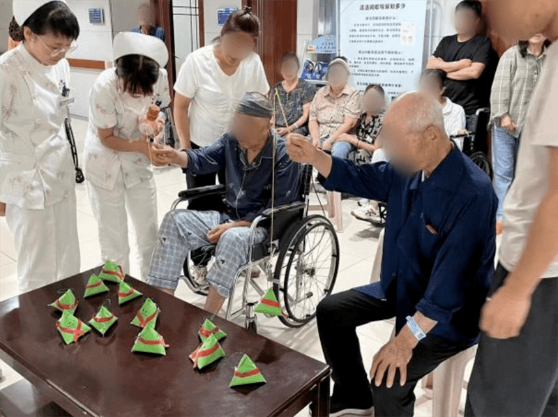 活動第二項釣粽子比賽:該項游戲,不僅可以鍛煉患者上肢力量、控制能力,更能幫助患者練習(xí)定向力和注意力。他們每個人認真努力,無論輸贏都是對自己的一份肯定和鼓舞!他們不放棄的精神獲得了在場所有人的陣陣掌聲。醫(yī)護人員也為參與游戲的患者準備了“健康平安包”,這些香包蘊含了艾草的香氣,可以驅(qū)除疲勞、改善睡眠,為患者帶去呵護和祝福。