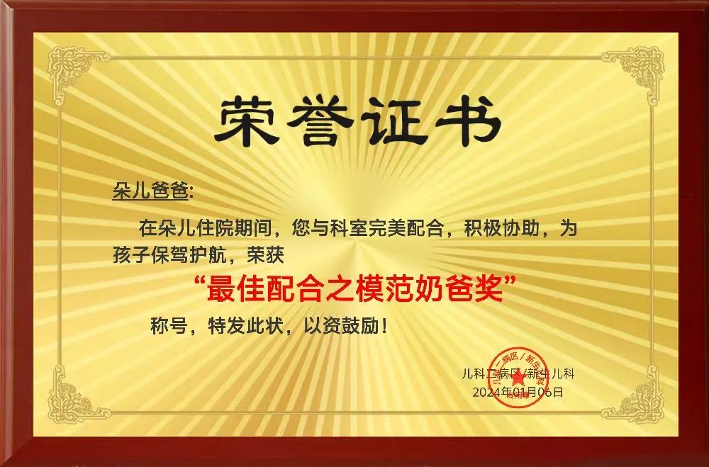 在接下來的幾天,朵爸說話也變得穩(wěn)重從容了,也不煩躁了,每次見到我都是笑嘻嘻的,住院第七天復(fù)查,結(jié)果都正常,順利出院,在出院當(dāng)天我送給朵爸一本“最佳配合之模范奶爸”的獎狀,并讓朵爸掃描家屬微信群,群里每天會發(fā)科普視頻和小知識,與眾多家屬共同學(xué)習(xí)。朵爸開心的像個孩子,點(diǎn)頭說太好啦。所有醫(yī)護(hù)人員都對朵爸贊許不斷,為朵爸豎起大拇指。一家人都很感激在住院期間遇到了像我這樣特別的護(hù)士。