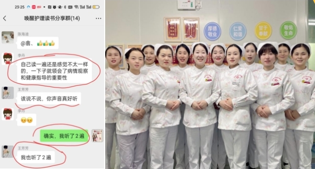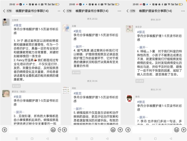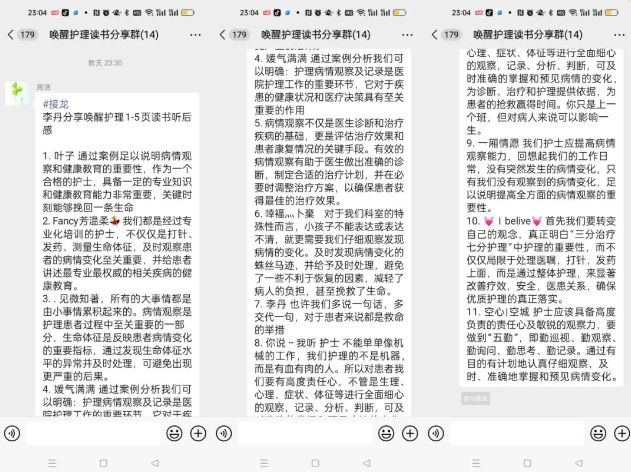 第一天讀書分享后,我主動(dòng)帶頭將聽書后感想發(fā)至群內(nèi),護(hù)士姐妹們熱情高漲,讀書聽書積極性很高,分別接龍分享了自己聽書后的感想,丹丹護(hù)士表達(dá)“自己讀一遍還是感覺不太一樣的,一下子就領(lǐng)會(huì)了病情觀察和健康指導(dǎo)的重要性”。芳芳護(hù)士分享“我們都是經(jīng)過專業(yè)化培訓(xùn)的護(hù)士,不僅僅是打針、發(fā)藥、測(cè)量生命體征,及時(shí)觀察患者的病情變化至關(guān)重要,并給患者講述最專業(yè)最權(quán)威的相關(guān)疾病的健康教育......”大家分別分享著自己的心得體會(huì),沉浸在讀書的氛圍中……