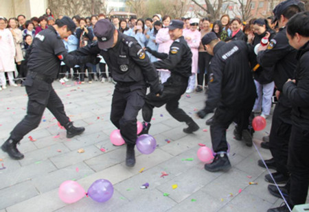 投籃、跳繩、呼啦圈項目也是爭奪的十分激烈,踩氣球項目將整個游藝活動推向高潮,一聲令下,大家一擁而上,你追我跳,圍觀的群眾也不時使壞,把靠近場邊的參賽者的氣球悄悄踩破,選手又氣又笑十分熱鬧。