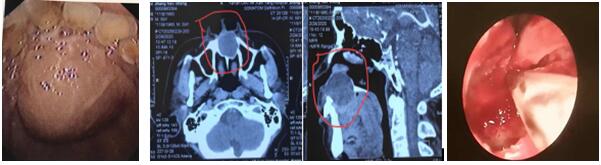 患者,男,59歲,因“發(fā)現(xiàn)口腔內(nèi)腫物3月”入院,腫物累及鼻底,并導(dǎo)致鼻底嚴重隆起,經(jīng)上頜骨CT三維重建檢查,腫物大,且口內(nèi)粘膜因腫物壓迫已很菲薄,還合并腎病綜合癥,口服激素一年余。住院后張立剛主任組織術(shù)前討論,認為患者如行傳統(tǒng)經(jīng)唇齦切口手術(shù)方式,極易導(dǎo)致傷口感染或不愈合,引起囗腔鼻腔漏,給患者帶來災(zāi)難性后果。經(jīng)查閱文獻,結(jié)合自身堅實的鼻內(nèi)鏡技術(shù)基礎(chǔ),決定行經(jīng)鼻內(nèi)鏡鼻底上頜骨囊腫摘除術(shù)。手術(shù)取鼻底小切口入路,切開黏膜后即見大量粘液溢出,清理后見口腔面黏膜菲薄,透光,與術(shù)前評估一致,遂將囊腫切除,等離子徹底止血,為防止壓迫導(dǎo)致口腔鼻腔漏形成,摒棄傳統(tǒng)的碘仿紗條壓迫兩周的觀念,術(shù)腔僅填塞可吸收明膠海棉,避免因填塞導(dǎo)致術(shù)后劇烈頭痛等不適。術(shù)后檢查見鼻腔結(jié)構(gòu)完整,口內(nèi)包塊明顯縮小,鼻面部無任何不適。