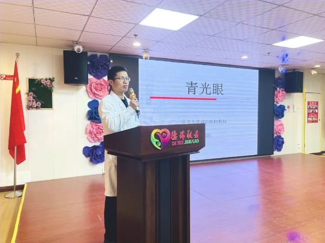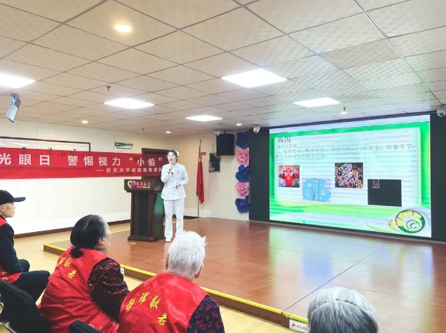 隨后,眼科楊維剛副主任醫(yī)師通過多媒體課件進行了青光眼科普講座。他講到青光眼青光眼是由于不同原因所導(dǎo)致的特殊的視神經(jīng)退行性改變,并有視野缺損等視功能改變的一類疾病。眼壓升高是其主要的危險因素。青光眼是全球首位不可逆性致盲性眼病,僅我國就有2000萬青光眼患者,致盲人數(shù)達567萬。這是一種全年齡疾病的表現(xiàn),尤其是40歲以上的人群更容易受到其影響。如果不及時診治,可能會導(dǎo)致不可逆轉(zhuǎn)的視野缺損、視神經(jīng)萎縮、視力下降,甚至導(dǎo)致完全失明,對于老年人,眼睛疾病的早篩查、早診斷、早治療非常重要。